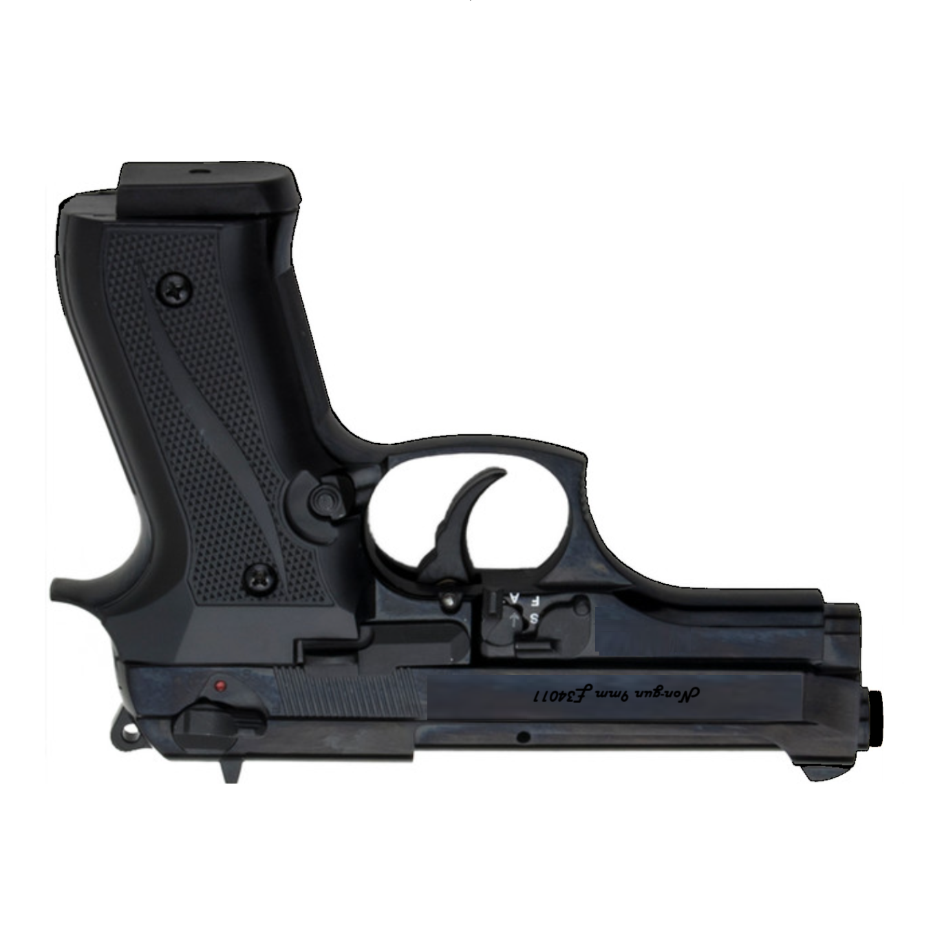 Introducing our fully automatic front firing machine gun pistol simulator. Front firing blank guns raise active shooter training to a whole new level. These are perfect for stage and film as they amplify the experience for your audience. The clip ejects with the push of a button and can be loaded with 13 9mm PAK blank cartridges. The front firing blank pistol has a working fire-selector switch, which changes the pistol over from semi- automatic to fully-automatic. In semi-automatic mode, the pistol fires off one shell with each pull of the trigger. On full-auto, though, the pistol will fire off its 15 rounds in 1.9 seconds, so long as the trigger is held. The Jackal only fires single action. The trigger safety is located on the switch actuator near the trigger where you toggle between semi-automatic and full automatic. The safety switch located near the hammer is not functional and for aesthetics only. All blank firing firearms should be treated like live, working firearms and afforded the same caution, care, and respect. Exercise the same caution and safety with a blank firing firearm as you would with a live firearm, whether it is loaded or not. You must be 18 or older to order and 21 or older to sign for the package. This front firing blank gun cannot be converted to fire live ammo.